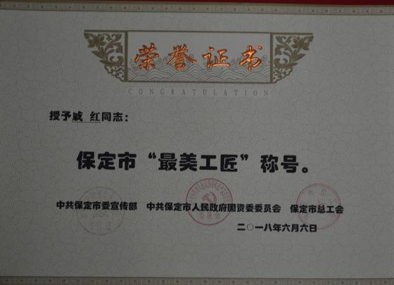 2017年7月,保定市委宣传部、市国资委、保定市总工会共同在全市开展了“最美工匠”推选展示活动。经过组织推荐、集中展示、群众投票、专家评议、社会公示等环节,最终戚红、储志强等10名同志被授予“最美工匠”称号。