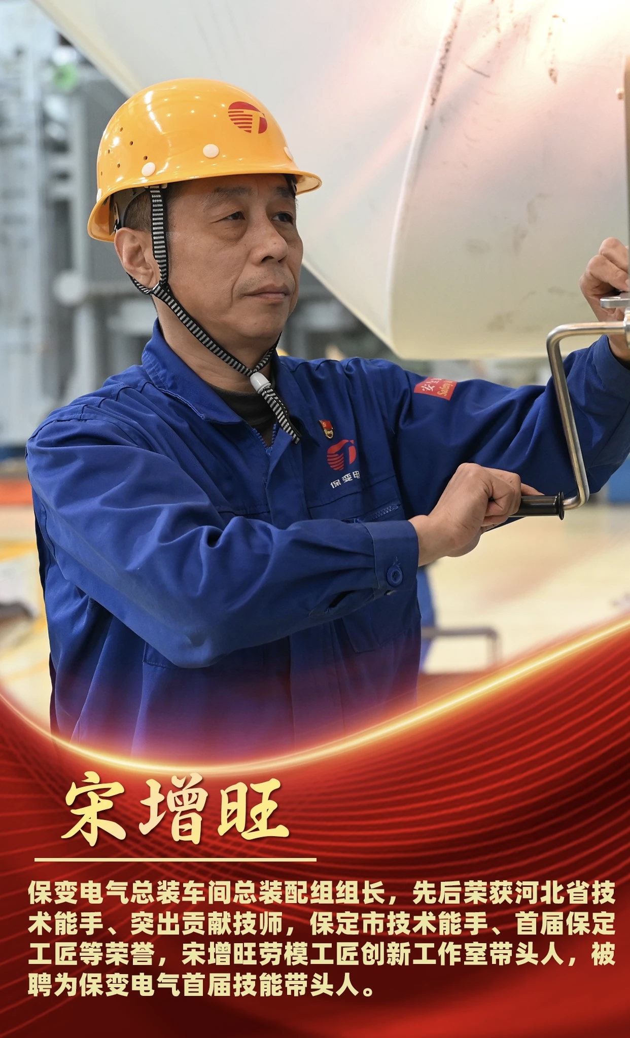 宋增旺自入职以来,始终坚守在变压器总装配一线,35年如一日扎根岗位,以“执着专注、精益求精、一丝不苟、追求卓越”的工匠精神为准则,在急难险重任务中抢在前、干在先,先后创新解决多项工艺技术难题,带班完成100余台国家重点工程用变压器总装配任务,以实际行动践行了一名共产党员的初心使命。