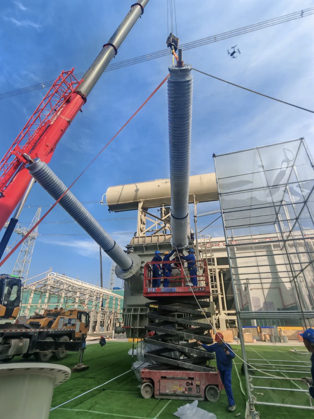 变压器现场安装过程中,现场工作团队克服陕北高原夏季高温多雨、冬季极寒低温等气候环境对产品组装工作的不利影响,科学统筹施工流程,精准细化作业方案,将责任落实到每个岗位、每道工序。